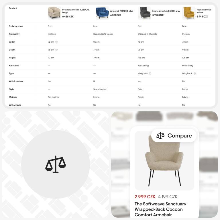 Compare produtos de forma clara numa tabela única, com fotografias, preços e todos os parâmetros lado a lado.