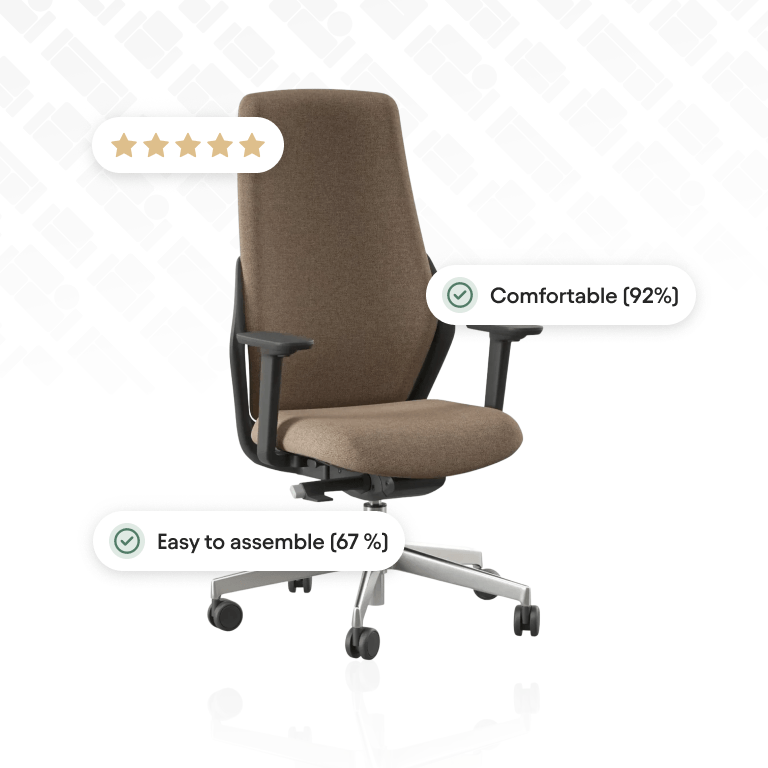 A IA processa automaticamente todas as avaliações e mostra os pontos fortes e fracos mais comuns dos produtos, incluindo opiniões externas de toda a internet.