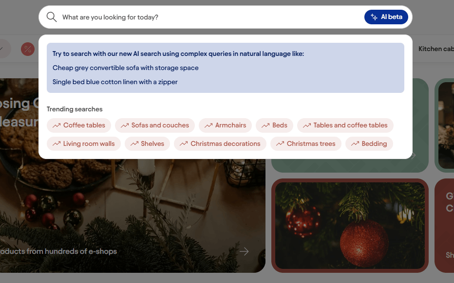 Escreve no campo de pesquisa aquilo de que precisa, usando uma frase completa com cor, preço, características e disponibilidade. A IA interpreta o pedido, seleciona automaticamente a categoria correta e aplica todos os filtros relevantes. Em vez de clicar sucessivamente em categorias, cores e parâmetros, obtém os resultados de uma só vez.