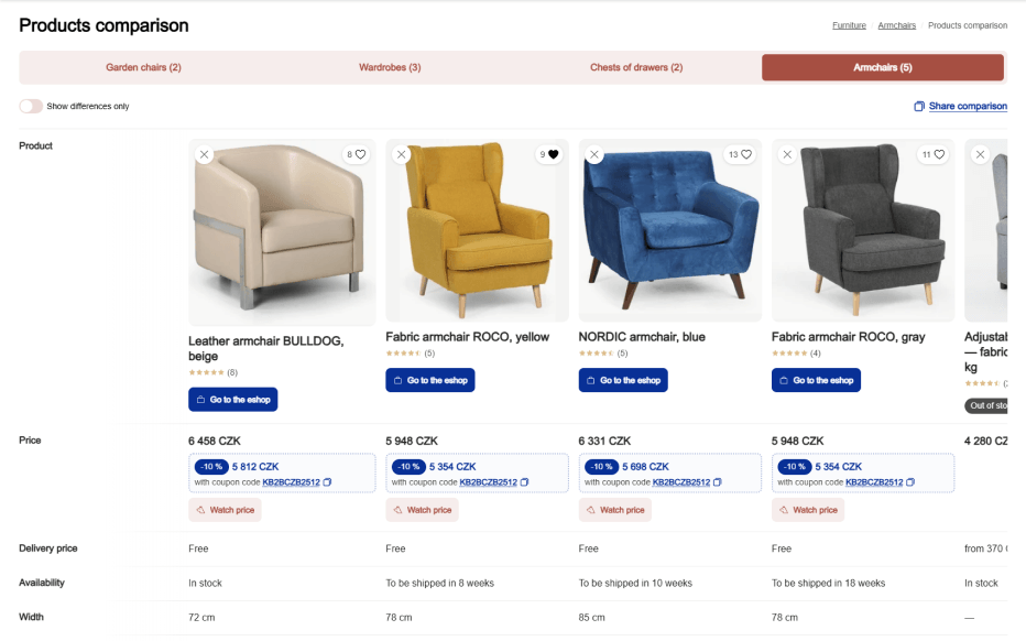 Em cada produto encontrará um ícone de comparação, tanto nas listagens como na página de detalhe. Com um simples clique, adiciona o produto a uma tabela onde poderá ver fotografias, preços e todos os parâmetros relevantes lado a lado. Falta alguma informação? A nossa IA completa automaticamente os dados com base na descrição do produto. Pode ocultar os parâmetros que são iguais em todos os produtos e focar-se apenas nas diferenças importantes. Os produtos são organizados automaticamente por categorias, garantindo que compara apenas o que realmente faz sentido. Encontrou uma comparação útil? Pode partilhá-la facilmente através de um link. Se estiver a navegar por vários produtos da mesma categoria, sugerimos automaticamente a sua comparação. Abaixo da tabela, verá ainda produtos recomendados que pode adicionar com um clique. E o melhor: a sua comparação fica guardada mesmo depois de fechar a janela.