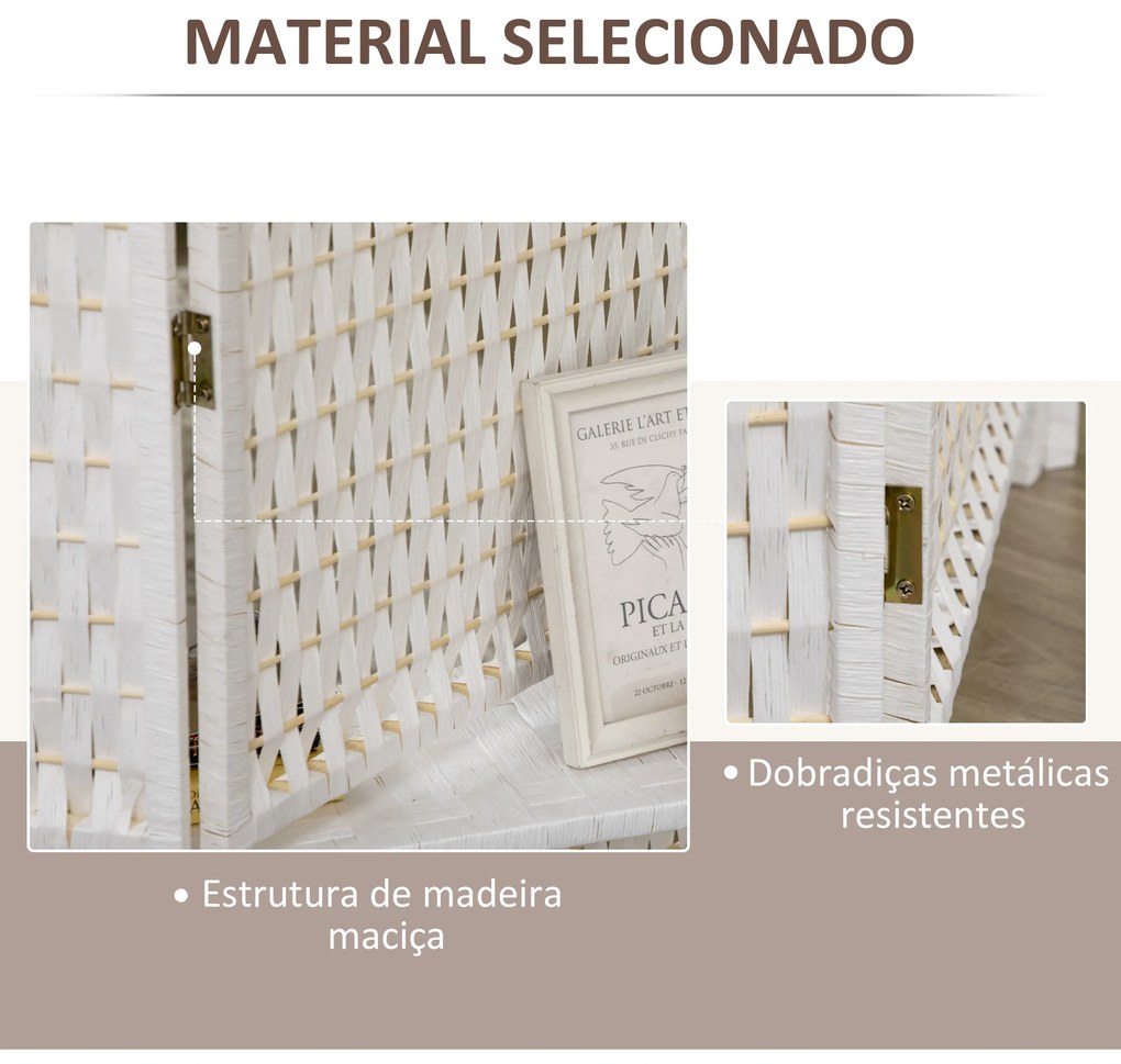 · SEPARADOR DE AMBIENTES ELEGANTE: Este separador de ambientes de 4 painéis com 2 prateleiras cria um espaço separado e privado em qualquer cômodo da sua casa. Ideal para diferenciar espaços e poder colocar alguns elementos decorativos por cima · TOM NATURAL: Com sua estrutura em madeira de pinho, e o corpo dos painéis com hastes de bambu e corda de papel, este divisor de ambiente traz um toque natural à sua decoração. Ideal para quartos, salas, escritórios, etc. · ESTRUTURA RESISTENTE: Feito de materiais naturais, a superfície do painel é feita de fibra de papel trançado efeito vime e a moldura é feita de madeira de pinho. Os 4 painéis são unidos por 9 fortes dobradiças de metal para fácil abertura e fechamento. As pernas mantêm a base elevada do solo para proteger da umidade · DOBRÁVEL: Graças ao seu design articulado de 4 painéis, este divisor de quarto pode ser dobrado, facilitando a movimentação e permitindo economizar espaço quando não estiver em uso · MEDIDAS TOTAIS: 181x180x1,6 cm (CxLxA). Peso máximo suportado: 5 kg. Sem necessidade de montagem Este separador de ambientes de bambu HOMCOM é ideal para quem precisa criar privacidade instantânea em um quarto ou isolar um espaço. Construído em madeira de pinho, bambu, corda de papel e dobradiças de metal, é um produto robusto, ideal para uso a longo prazo. Equipado com 2 prateleiras removíveis onde você pode colocar plantas, molduras ou outros objetos decorativos. Dê um toque elegante e rústico à sua casa com este divisor de ambientes! Características · É perfeito para separar ambientes e criar um espaço mais privativo · Ideal para quartos, sala, escritórios, etc. · Design dobrável de 4 painéis, fácil de mover e armazenar · Divisor de ambientes com estrutura em madeira de pinho e corpo com hastes de bambu e tecido de fibra de papel que dará um toque elegante à sua casa · Inclui 2 prateleiras removíveis, que permitem colocar plantas, molduras e outras decorações · Possui 9 dobradiças metálicas para maior estabilidade e extensão e retração suaves · Pés elevados para maior estabilidade e para manter o espalhador levantado · Não requer montagem Especificações · Cor: Branco · Material: Tecelagem de corda de papel, varas de bambu, moldura de madeira de pinho · Medidas totais: 181x180x1,6 cm · Tamanho dobrado: 180x45x8 cm · Tamanho de cada painel: 180x45 cm · Tamanho de cada prateleira: 170x20 cm · Altura das pernas: 5,5 cm · Carga máxima: 5kg · Referência: 830·628V00WT