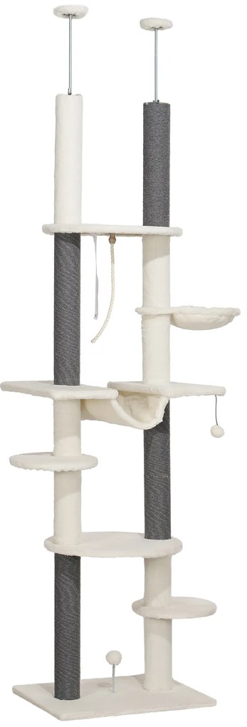 PawHut Arranhador para Gatos do Chão ao Teto 225-255 cm com 7 Níveis Rede Plataformas Postes de Arranhar Creme e Cinza