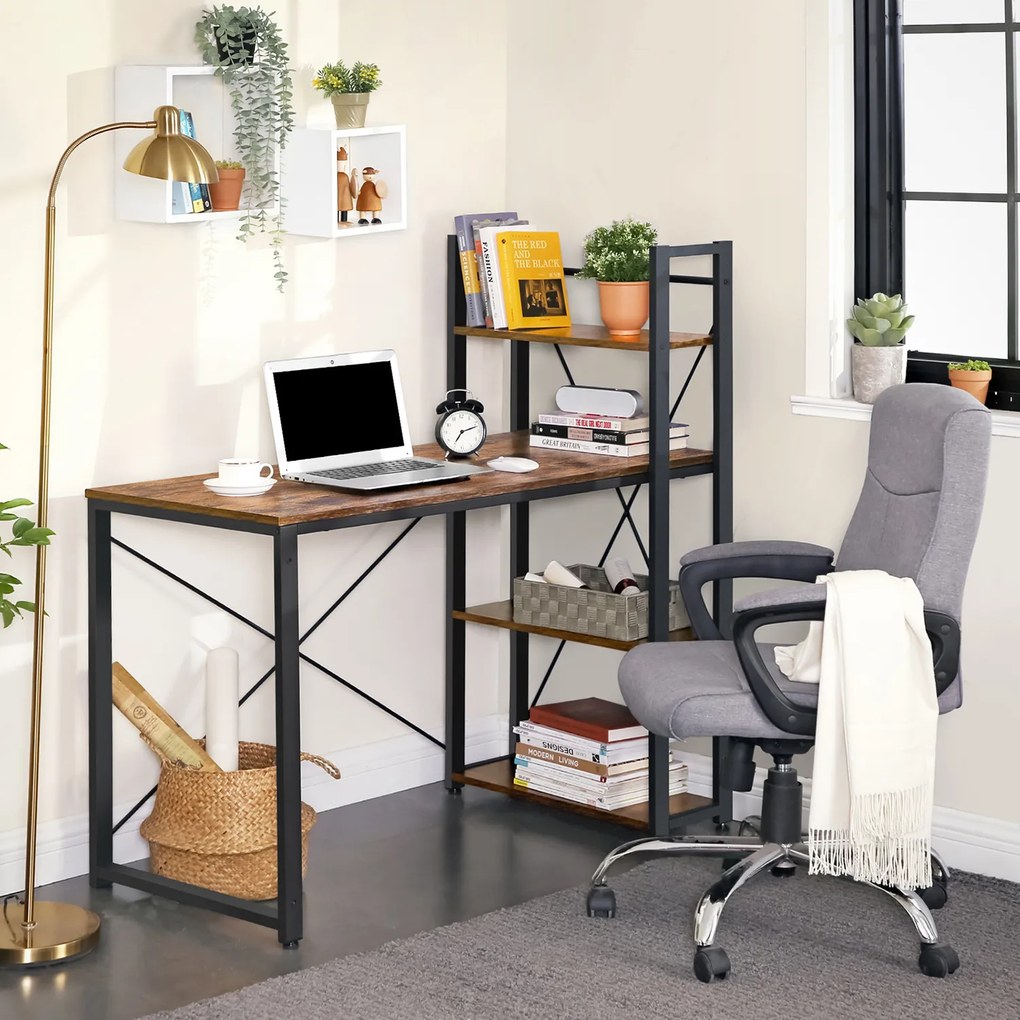 TUDO AO SEU ALCANCE: Torne o seu trabalho um pouco mais produtivo, guardando todos os utensílios de escritório ao seu alcance. Esta secretária espaçosa com 3 prateleiras oferece espaço suficiente para esta tarefa, bem como para ficheiros, livros e fotografias dos seus animais de estimação DIREITA OU ESQUERDA? Consegue trabalhar melhor se os seus documentos estiverem à sua esquerda? Ou prefere tê-los à sua direita? Fixe as prateleiras desta secretária para computador no lado que preferir COM FACILIDADE: Esta secretária de design industrial facilita muito a sua vida graças às prateleiras, às opções de montagem e à superfície espaçosa. As instruções claras e as peças sobresselentes também tornam a montagem muito fácil NÃO BALANÇA: Graças aos pés reguláveis por baixo de cada perna desta secretária, os ligeiros desníveis no chão podem ser nivelados para que esta peça de mobiliário não balance constantemente quando trabalha nela O QUE OBTÉM? Uma secretária de 120 cm de comprimento com prateleiras que podem ser fixadas à direita ou à esquerda, acessórios de montagem e instruções claras. Psst, esta secretária faz parte da nossa fascinante coleção ALINRU! Detalhes do produto: - Cor: castanho Vintage-preto - Material: aglomerado de madeira, aço - Tamanho: 120 x 60 x 120 cm (C x L x A) - Peso: 20,7 kg - Capacidade de carga estática máx. Capacidade de carga estática: 50 kg Âmbito de fornecimento: - 1 x secretária - 1 x pacote de acessórios - 1 x manual de instruções (DE, EN, FR, ES, IT)