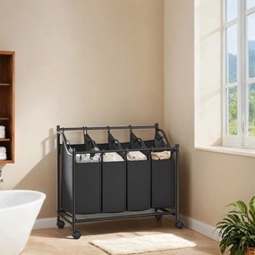 Grande capacidade: este cesto para roupa suja com 140 litros tem espaço para toda a sua roupa e evita pilhas de roupa espalhadas Fácil classificação da roupa: quatro sacos separados classificam a sua roupa e tornam o dia da lavagem numa brincadeira de crianças Móvel e fixável: pegas e rodas facilitam o transporte, rodas bloqueáveis garantem estabilidade Sacos portáteis e resistentes à água: removíveis e fáceis de transportar, com revestimento em PVC repelente à água Robusto e duradouro: fabricado em tecido Oxford 600D resistente e tubos de aço robustos, suporta até 40 kg Detalhes do produto: - Dimensões: 87,5 x 38,5 x 67/81 cm (C x L x A) - Dimensões de cada saco de roupa: 34 x 20 x 45/58 cm (C x L x A) - Peso: 4,5 kg - Capacidade estática máxima total: 40 kg - Capacidade estática máxima por saco: 10 kg - Material: tubo de aço revestido a pó, saco de fibra de poliéster 600D, rolo de nylon - Cor: preto Conteúdo da embalagem: Conteúdo da embalagem: - 1 x Cesto para roupa suja